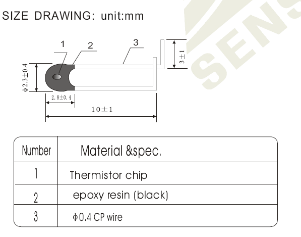 | Specification | R25℃ (KΩ) | B25/50℃ (K) | Disspation constant | Thermal time constant | Operating temp. range |